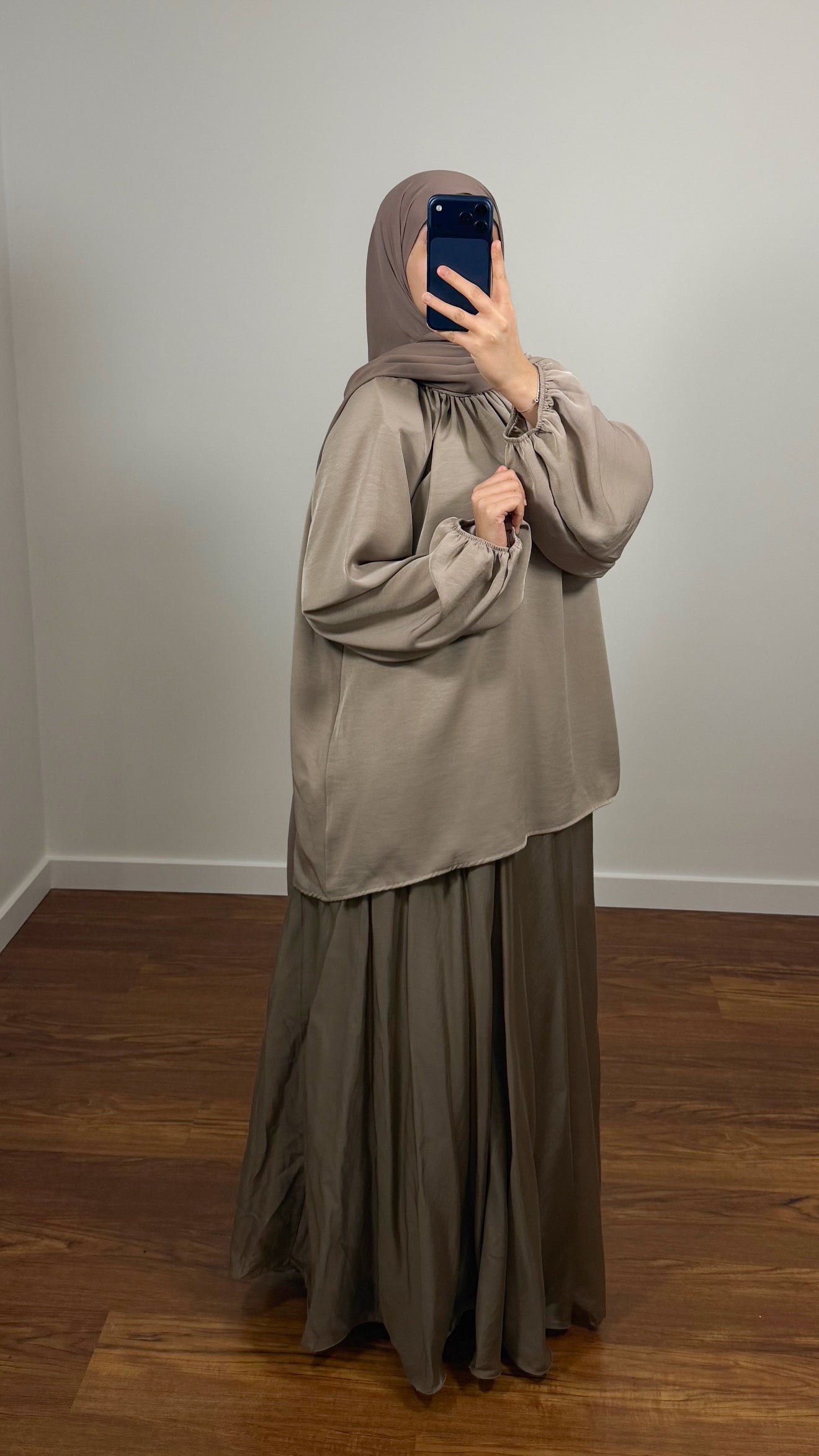 Cet ensemble élégant se compose d’une blouse fluide à manches bouffantes et d’une jupe longue assortie, parfait pour un look à la fois modeste, confortable et raffiné.